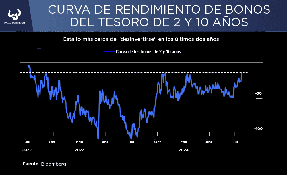 Por lo general, los rendimientos a más largo plazo son más altos porque hay un mayor riesgo asociado al largo plazo. Cuando la curva se invierte, con rendimientos a dos años más altos, históricamente ha sido un gran indicador de recesión. De alguna manera, la curva ha estado invertida durante más de dos años. Ahora, está más cerca de desinvertirse desde julio de 2022. Eso generalmente sucede en vísperas de una recesión: