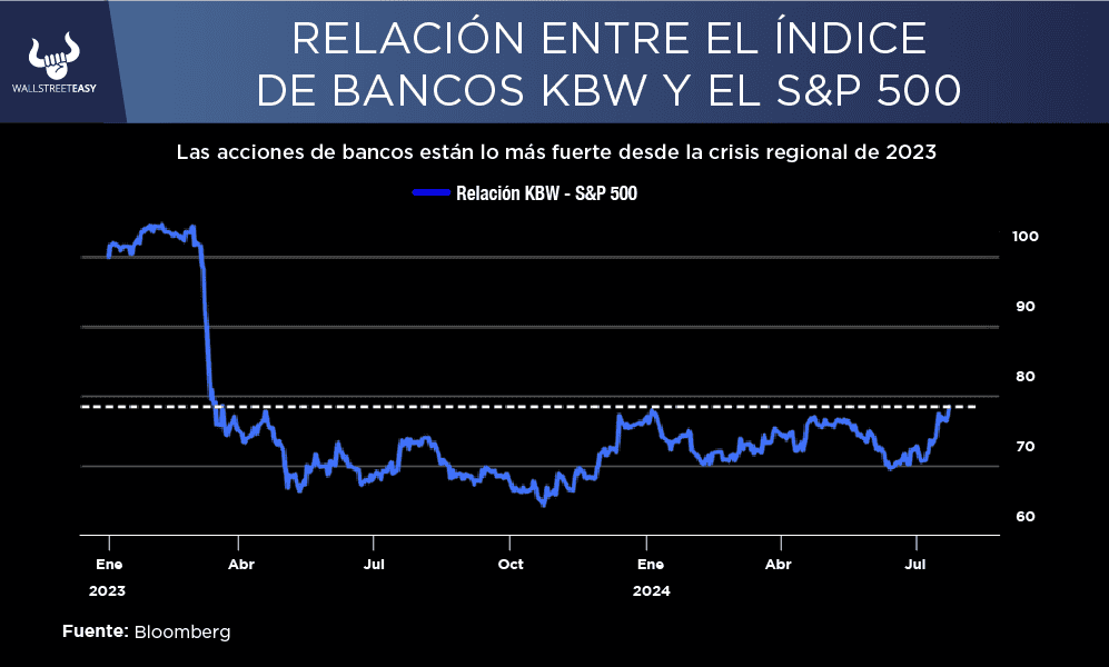 Bancos: La breve, pero brutal crisis bancaria regional de la primavera de 2023, que vio el colapso de Silicon Valley Bank y otros, ha sido seguida por un bajo rendimiento prolongado para el sector bancario. Eso ahora parece haber terminado. El índice bancario KBW en relación al S&P 500 está en su nivel más alto desde marzo de 2023.