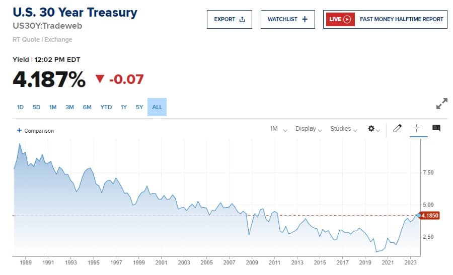 Los Bonos del Tesoro de Estados Unidos han tenido un fuerte aumento en su rendimiento, sobre todo los bonos a largo plazo, lo que parece una señal de que el mercado se espera que la economía norteamericana no entre en recesión en los próximos meses. Esto viene dado por el hecho de que los bonos a corto plazo no están subiendo demasiado, mientras que los de largo plazo como los de 10 a 30 años están llegando a niveles no visto desde hace varios años. En el caso de los bonos a 10 años, desde octubre de 2022 y desde 2009, para los bonos a 30 años.