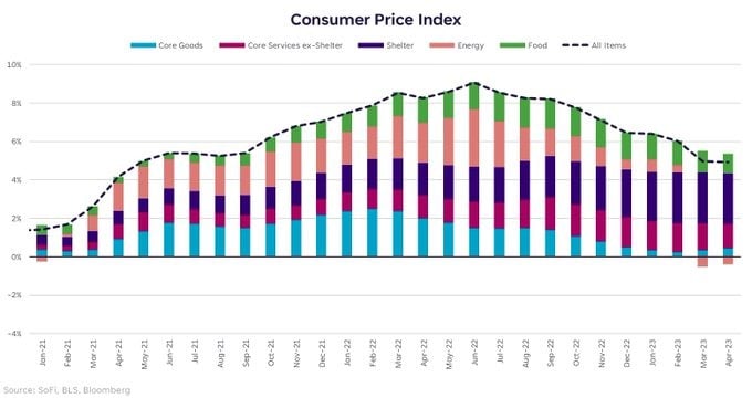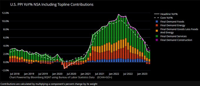 Además, vimos una caída en otros segmentos, como hoteles, comida (que fue uno de los más inflacionarios en 2022) ayudando a que se mantuviera bajo control la inflación en este reporte. Si bien todo lo comentado anteriormente son buenas noticias, la mala noticia es que la reducción en los precios sigue siendo muy lenta, no está bajando a un ritmo suficiente para que la Reserva Federal relaje su postura. Este contexto no apoya la idea de que la FED bajará las tasas en los próximos meses, que es básicamente a lo que está apostando el mercado, 1% de acá a final de año. El panorama se completa con el reporte de inflación al productor, que salió 2.3% vs 2.4% esperado en el anual, y 0.2% vs 0.3% esperado en el mensual. La inflación de los productores sigue concentrada en los servicios, al igual que para los consumidores, pero viene bajando de manera importante, y esta dentro del objetivo de la Reserva Federal de 2%.