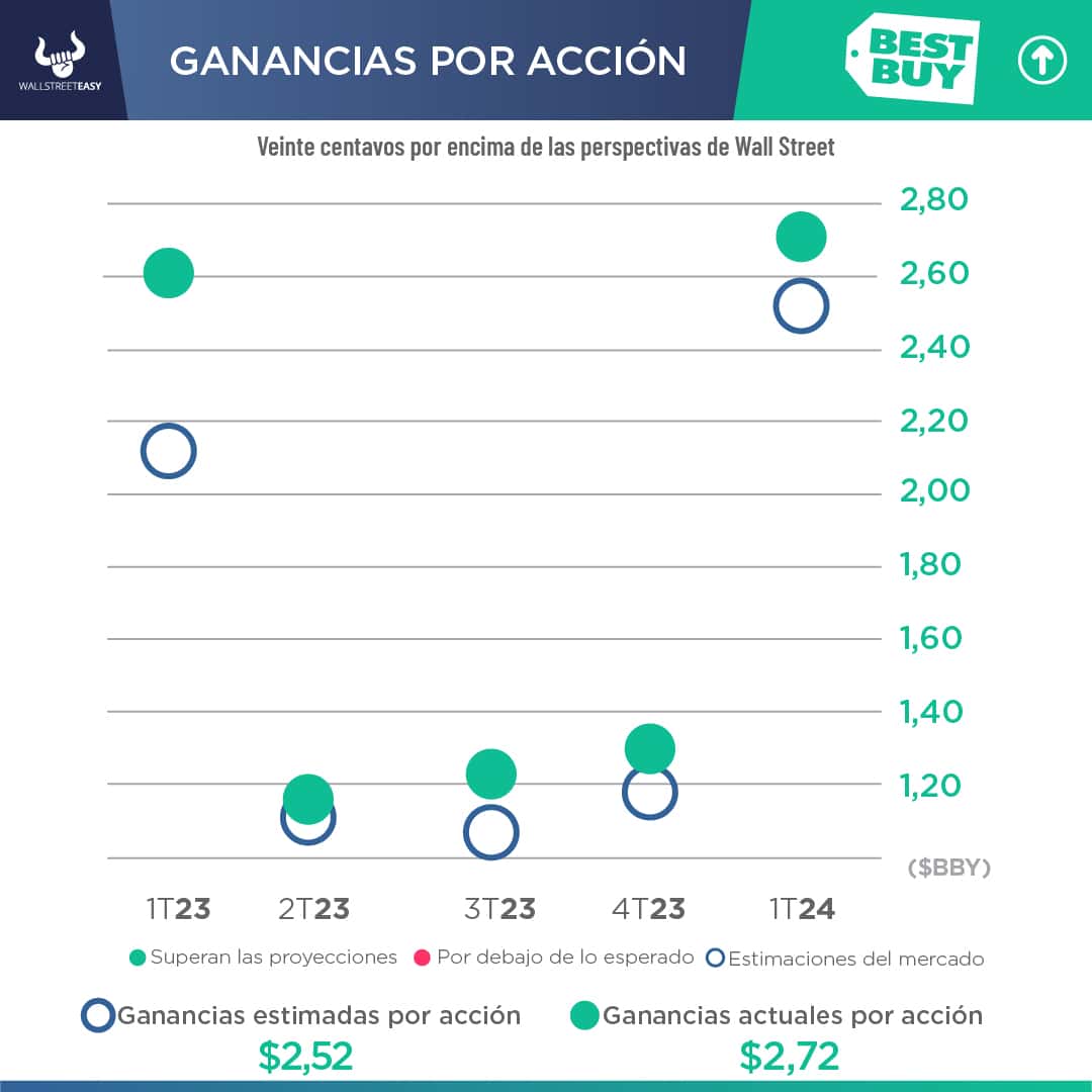 • Las previsiones contribuyeron a la subida de las acciones. Para el año fiscal 2025, Best Buy anticipa ganancias de entre $5,75 y $6,20 por acción, con el extremo superior de esa orientación superando las estimaciones de $6,16.