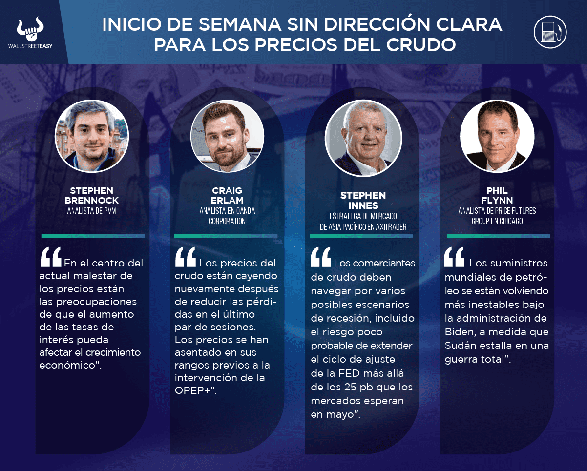 Los precios del crudo empezaron la semana sin una dirección clara, en el que las crecientes preocupaciones sobre una desaceleración económica y un dólar más fuerte se sopesaron con las esperanzas de una mayor demanda china y menores existencias de crudo en EEUU. Nuevo rango esperado es de $76 - $82.