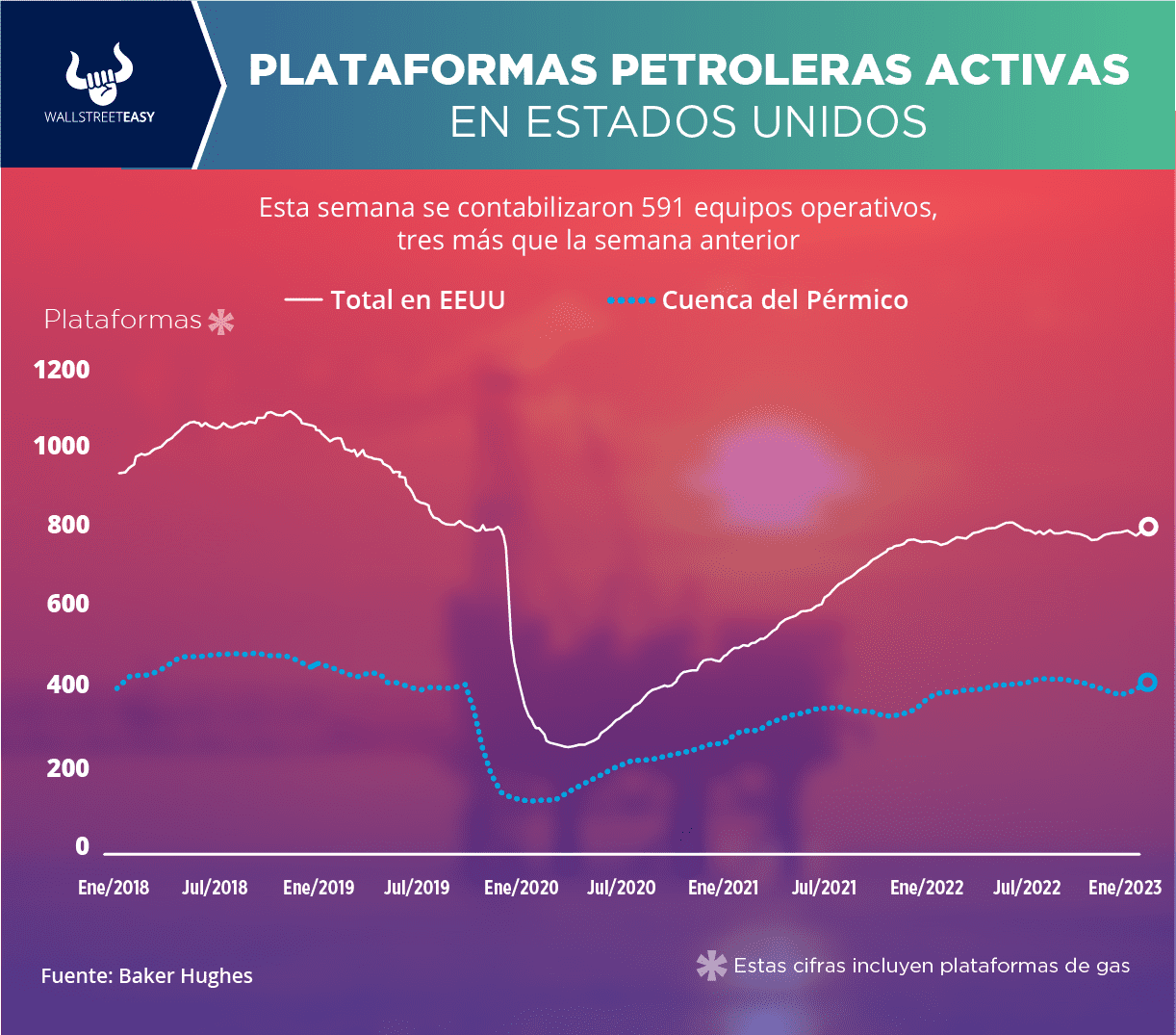 CUÉNTAME SOBRE LAS PLATAFORMAS PETROLERAS EN EEUU De acuerdo con información de Baker Hughes, actualmente en EEUU se encuentran 753 equipos activos (incluyendo los de gas). En la actividad petrolera se contabilizaron 591, tres más que la semana anterior. En las operaciones de gas hay 159 equipos operativos, dos más que hace siete días. Hace un año estaban activas 695 plataformas.