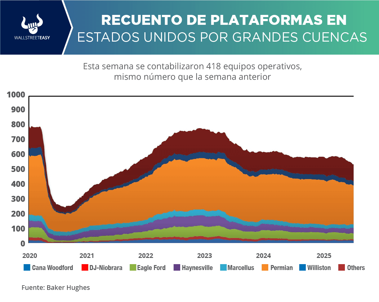 CUÉNTAME SOBRE LAS PLATAFORMAS PETROLERAS EN EEUU De acuerdo con información de Baker Hughes, actualmente en EEUU se encuentran 548 equipos activos (incluyendo los de gas). En la actividad petrolera se contabilizaron 418, mismo número que la semana anterior. En las operaciones de gas hay 121 equipos operativos, uno más que hace siete días. Hace un año estaban activas 585 plataformas.