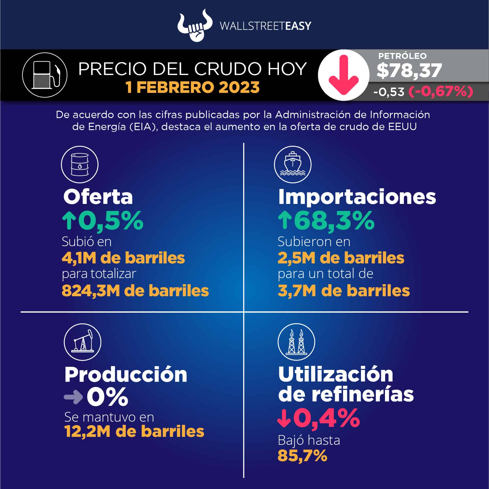 PANORAMA EN EEUU         La Administración de Información de Energía (EIA, por sus siglas en inglés) reportó 824,3M de barriles en existencias de crudo, tanto comerciales como estratégicas, lo que representa un aumento de 4,1M de barriles. El Instituto Americano del Petróleo (API, por sus siglas en inglés) había estimado una subida de 6,3M de barriles. A continuación, otros datos relevantes del informe:
