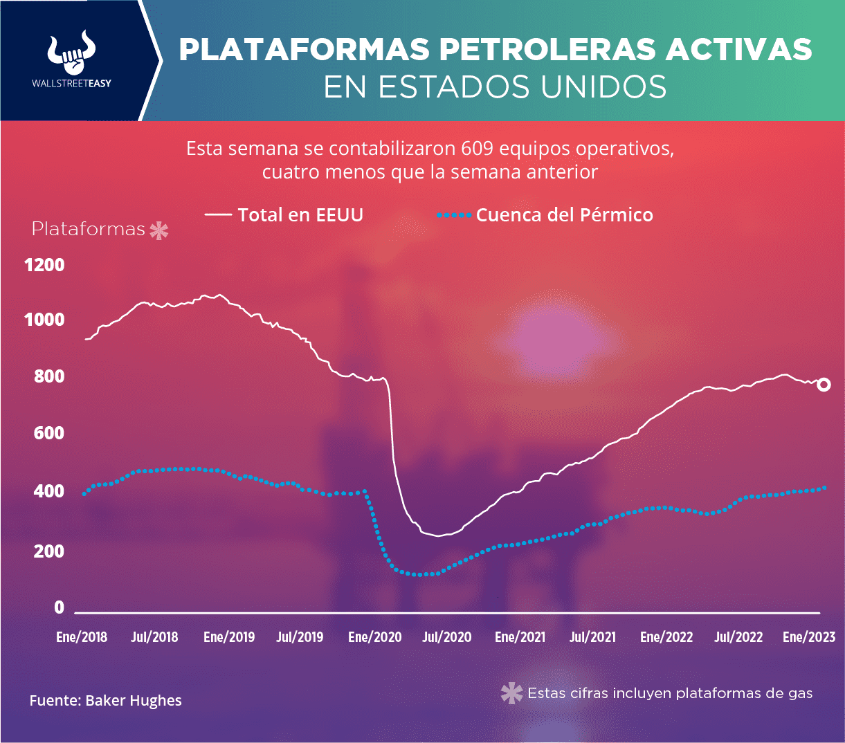 CUÉNTAME SOBRE LAS PLATAFORMAS PETROLERAS EN EEUU De acuerdo con información de Baker Hughes, actualmente en EEUU se encuentran 771 equipos activos (incluyendo los de gas). En la actividad petrolera se contabilizaron 609, cuatro menos que la semana anterior. En las operaciones de gas hay 160 equipos operativos, cuatro más que hace siete días. Hace un año estaban activas 610 plataformas.