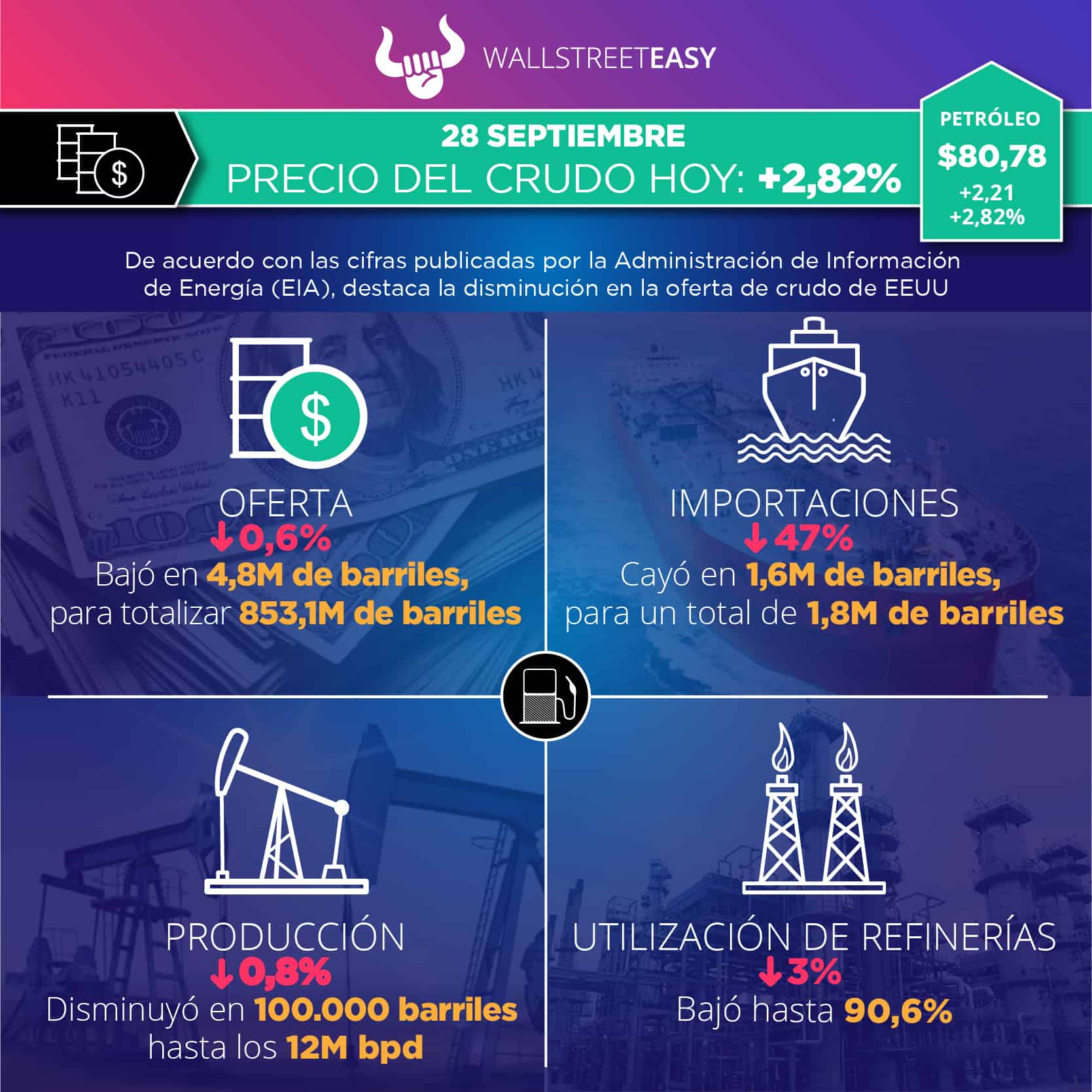 PANORAMA EN EEUU          La Administración de Información de Energía (EIA, por sus siglas en inglés) reportó 853,1M de barriles en existencias de crudo, tanto comerciales como estratégicas, lo que representa una baja de 4,8M de barriles. El Instituto Americano del Petróleo (API, por sus siglas en inglés) había estimado una subida de 4,1M de barriles. A continuación, otros datos relevantes del informe: