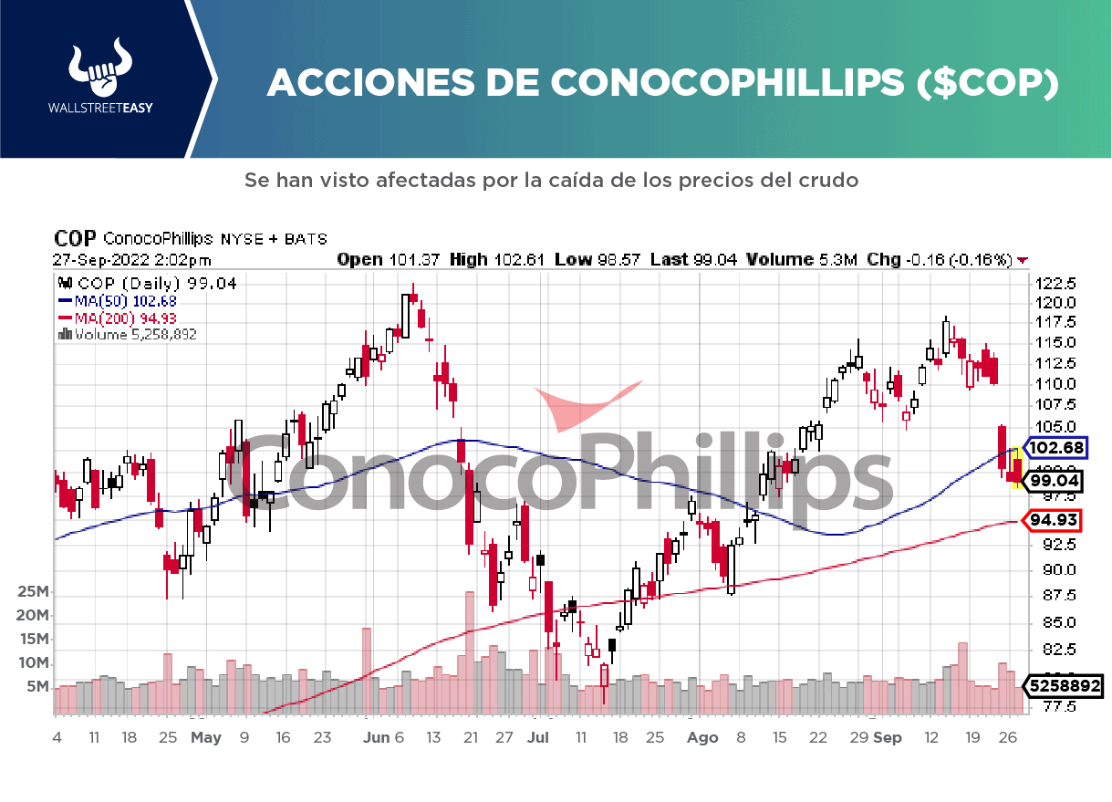 LA NOTICIA Los beneficios de ConocoPhillips ($COP) superan los $5.000M en el segundo trimestre de 2022. PONME AL DÍA La empresa petrolera dijo que sus ganancias del segundo trimestre se duplicaron hasta alcanzar los $5.100M, o $3,96 por acción, frente a los $2.100M, o $1,55 por acción, del trimestre anterior. Excluyendo elementos, los beneficios ajustados fueron de $3,91 por acción que superó el objetivo de $3,86 por acción. ES MÁS Los beneficios y los beneficios ajustados aumentaron con respecto al segundo trimestre de 2021 debido principalmente a los mayores precios del crudo. El precio medio total de la empresa fue de $88,57 por barril de petróleo equivalente (BOE), +77% más que los $50,03 por BOE del 2T21. ¿POR QUÉ ES RELEVANTE? Para el tercer trimestre, la producción se estima entre 1,7M y 1,76M bpd, y se redujo de 1,76M a 1,74M al día. Esto está relacionado principalmente con el riesgo de la producción prevista en Libia en la segunda mitad del año, así como con algunas modestas actualizaciones en toda la cartera, dijo la empresa. ¿ALGUNA NOVEDAD ADICIONAL? ConocoPhillips anunció un aumento de $5.000M en la devolución de capital prevista para 2022, hasta los $15.000M. POR ÚLTIMO MKM Partners subió su objetivo de precio sobre las acciones de ConocoPhillips de $110 a $118 y dio a la compañía una calificación de "compra" en una nota de investigación del pasado viernes 26 de agosto. EN CONCRETO "El segundo trimestre arrojó unos sólidos resultados financieros y presentó excelentes oportunidades para acelerar el progreso de nuestro triple mandato de suministrar de forma fiable y responsable la producción de petróleo y gas para satisfacer la demanda de la vía de la transición energética, ofrecer una rentabilidad competitiva del capital a nuestros accionistas y alcanzar nuestra ambición de emisiones operativas nulas", dijo Ryan Lance, CEO de ConocoPhillips.