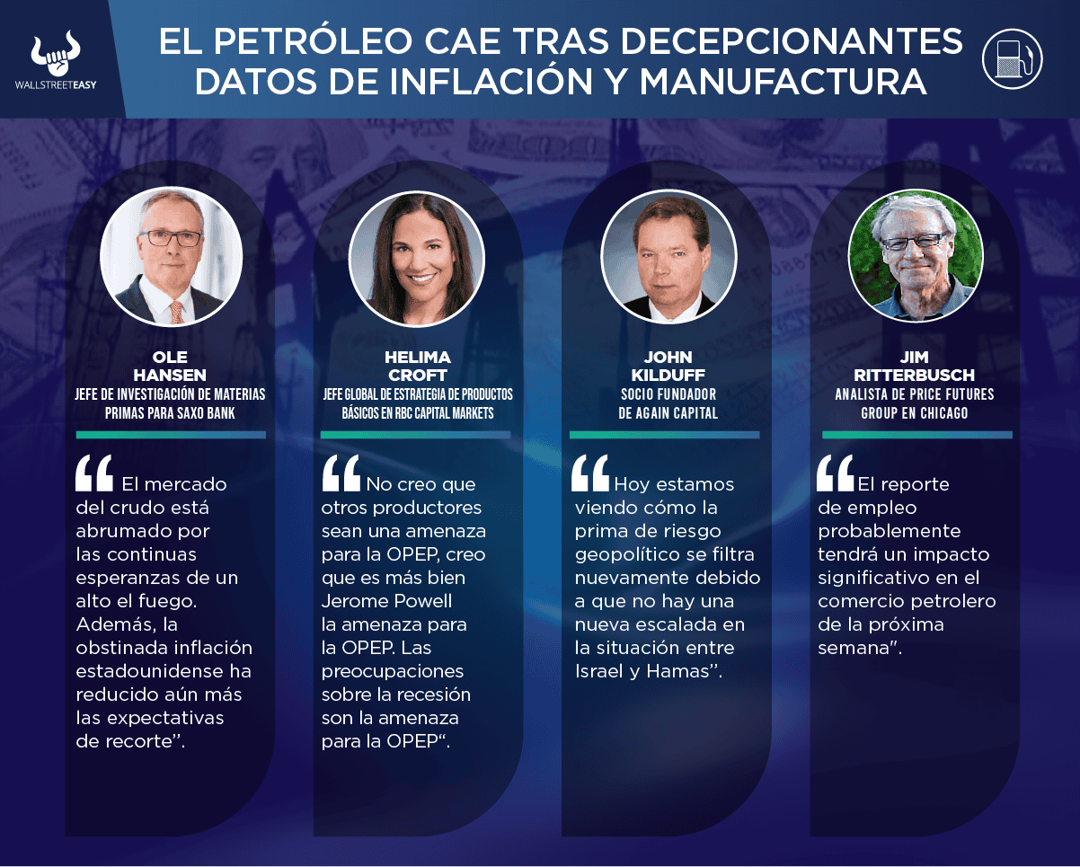 El petróleo cayó por debajo de los $82 por barril cuando el mercado se vio golpeado por otra ronda de datos económicos y de inflación decepcionantes. Los operadores están valorando cada vez más el riesgo de que la Reserva Federal pueda volver a subir las tasas de interés en algún momento. Nuevo rango esperado es de $81 - $84.