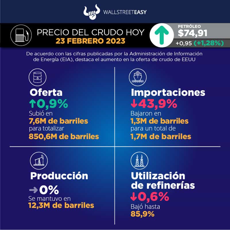 PANORAMA EN EEUU La Administración de Información de Energía (EIA, por sus siglas en inglés) reportó 850,6M de barriles en existencias de crudo, tanto comerciales como estratégicas, lo que representa un aumento de 7,6M de barriles. El Instituto Americano del Petróleo (API, por sus siglas en inglés) había estimado una subida de 9,8M de barriles. A continuación, otros datos relevantes del informe: