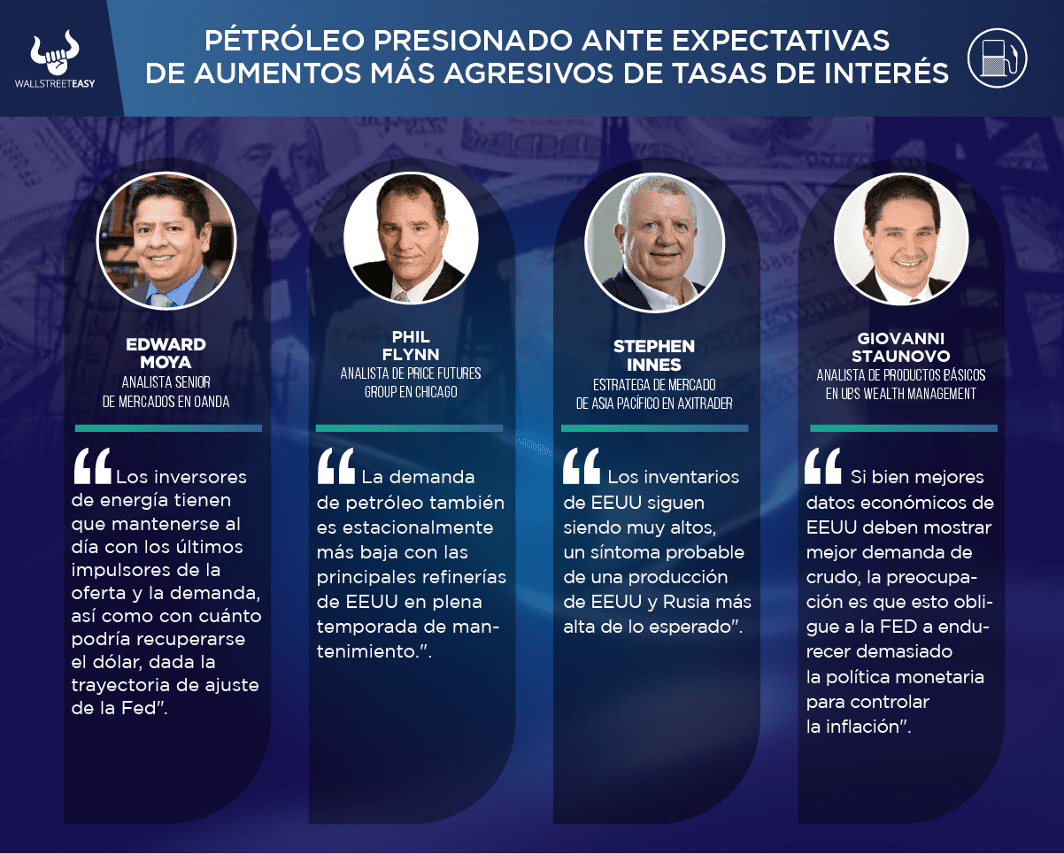 Precios del crudo empezaron la semana con pérdidas cuantiosas tocando su nivel más bajo en dos semanas, ya que los inversionistas se preocuparon más de que los datos económicos recientes significarán aumentos más agresivos de las tasas de interés por parte de los bancos centrales, lo que presionará el crecimiento económico y la demanda de combustible. Nuevo rango esperado es de $74 - $82.