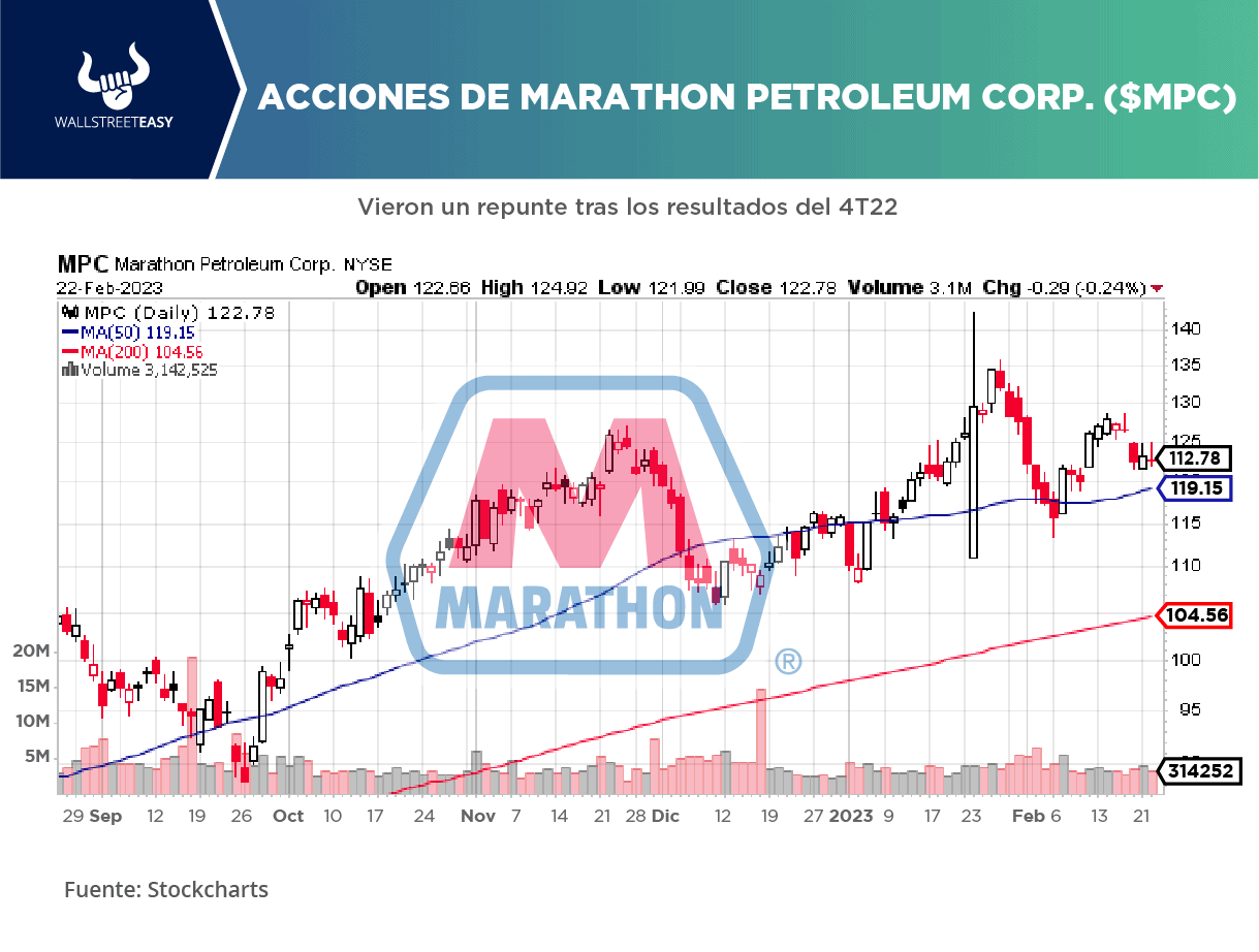 LA NOTICIA Marathon Petroleum Corp. ($MPC) superó las expectativas de Wall Street sobre su beneficio del cuarto trimestre, al dispararse sus márgenes en un contexto de escasez de suministros y elevada demanda de productos refinados. PONME AL DÍA Marathon, con sede en Findlay (Ohio), obtuvo en el 4T22 un beneficio neto ajustado de $6,65 por acción, frente a la estimación media de los analistas de $5,67 por acción, según datos de Refinitiv. ES MÁS La empresa tuvo ingresos de $39.820M durante el trimestre, frente a la estimación de consenso de $35.290M, y una rentabilidad sobre fondos propios del 42,26% y un margen neto del 8,07%. ¿POR QUÉ ES RELEVANTE? El año pasado, los beneficios derivados de la transformación del petróleo en gasolina, gasóleo y combustible para aviones alcanzaron máximos de varias décadas, ya que las refinerías funcionaron a pleno rendimiento para satisfacer la creciente demanda en medio de una contracción de la oferta tras la guerra en Ucrania y el cierre de plantas. ¿ALGUNA NOVEDAD ADICIONAL? La utilización de la capacidad de crudo de Marathon se situó en torno al 94% en el 4T22, lo que se tradujo en una producción total de 2,9M bpd. Para el 1T23, se espera un volumen de 2,5M bpd, lo que representa una utilización del 88%, debido a una mayor actividad de reacondicionamiento en el primer semestre de este año. POR ÚLTIMO La principal refinería de EEUU también aprobó una recompra adicional de acciones por valor de $5.000M, mientras que su rival Phillips 66 ($PSX) devolvió $1.200M a los accionistas a través de dividendos y recompras durante el trimestre. EN CONCRETO "Hemos cambiado significativamente nuestra forma de llegar al mercado desde una perspectiva comercial en toda la empresa", declaró Rick Hessling, vicepresidente senior de Materias Primas Globales de Marathon.