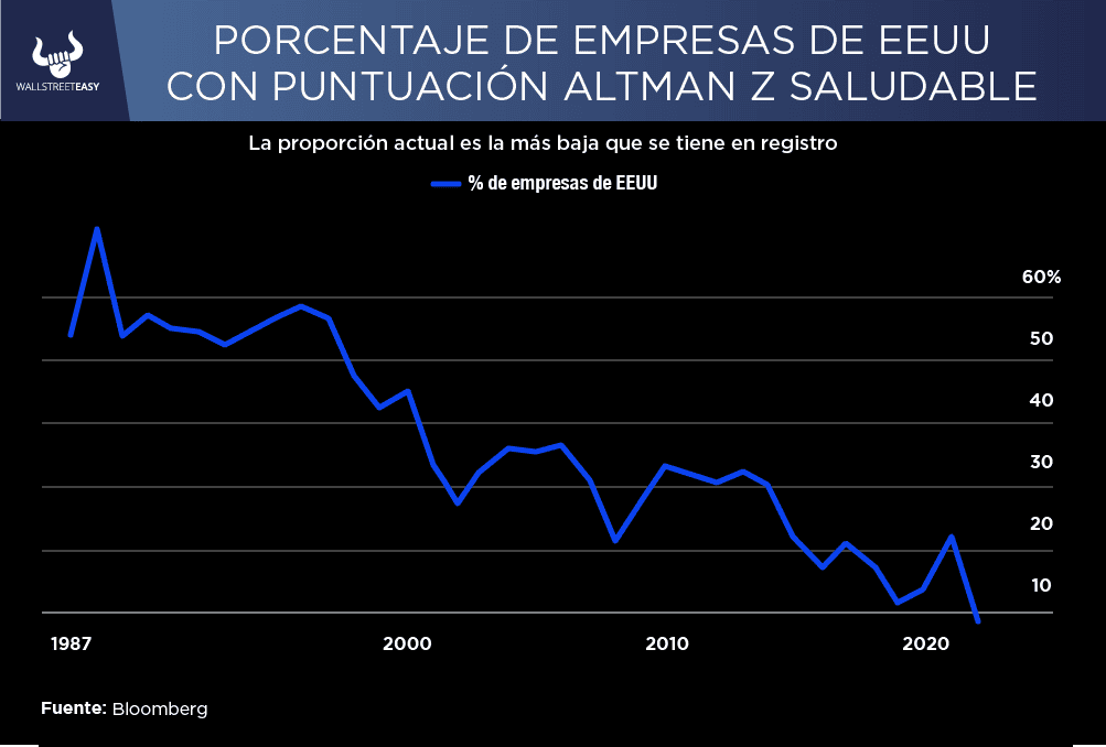 Dicha medida combina conceptos como rentabilidad de cuentas, apalancamiento, liquidez, solvencia y ratios de actividad. En el último siglo, más de la mitad de todas las empresas públicas parecían fuertes y saludables, según la métrica de Altman. Esa cifra ahora ha caído por debajo del 10% por primera vez desde que se tiene registro: