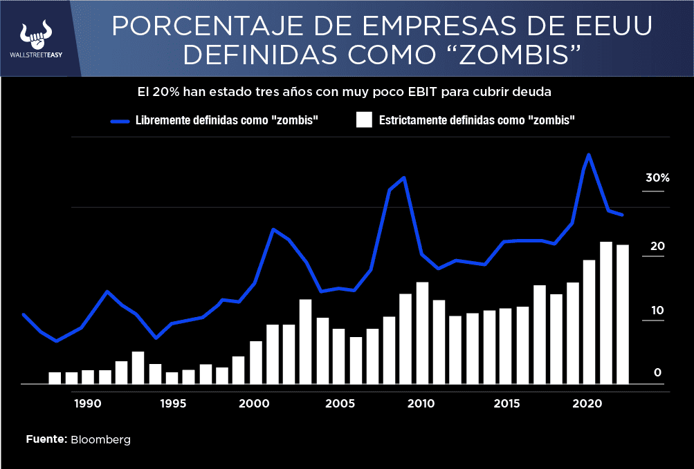 Este otro gráfico de Fathom Consulting define a las zombis como empresas cuyos beneficios antes de intereses e impuestos no cubrieron sus costos de intereses durante un año, y también de forma más estricta, cuando esta situación debe haber persistido durante al menos tres años consecutivos. Según este estándar, poco más de una quinta parte de las empresas estadounidenses son zombis: