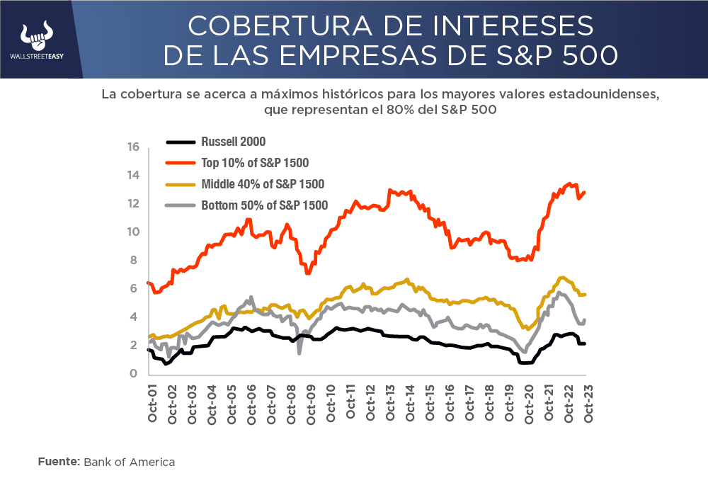 Es bien sabido que el mercado de valores está cada vez más polarizado y concentrado, con unas pocas empresas de gran capitalización dominando los índices bursátiles. El crédito contribuye a esto. En este gráfico de Bank of America, que mide la cobertura que tienen las empresas para pagar los intereses, se observa que las 150 empresas más grandes rara vez han sido más fuertes en esta métrica. Las empresas más pequeñas son dramáticamente más débiles y han experimentado un debilitamiento significativo en los últimos dos años:
