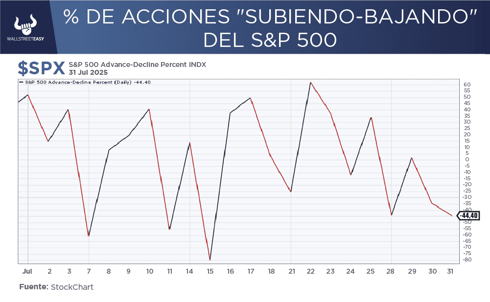 ¿OTRO DATO RELEVANTE? La valoración de estas gigantes tecnológicas en relación con el resto de las empresas del S&P 500 es comparable a la que se vio en el pico de la burbuja dot.com. Una concentración tan extrema en el índice puede hacer que el mercado sea más vulnerable a una mayor volatilidad y a posibles caídas significativas si alguna de estas grandes empresas tropieza. ¿QUÉ MÁS PASÓ? Un dato que subraya este desequilibrio es que, a pesar de sus enormes gastos en infraestructura de inteligencia artificial, estas empresas solo representan alrededor del 20% de las ganancias totales del S&P 500. ¿OTRO ACONTECIMIENTO? A un nivel más profundo, la "amplitud del mercado", una medida que indica cuántas acciones están subiendo en relación con las que están bajando, es muy débil. Solo 9% de las empresas están en máximos de 52 semanas, un número sorprendentemente bajo que sugiere que la gran mayoría de las acciones no están participando en este repunte. Adicionalmente, vemos cómo en julio más del 50% de las acciones subieron conjuntamente a pesar de estar llegando a nuevos máximos.