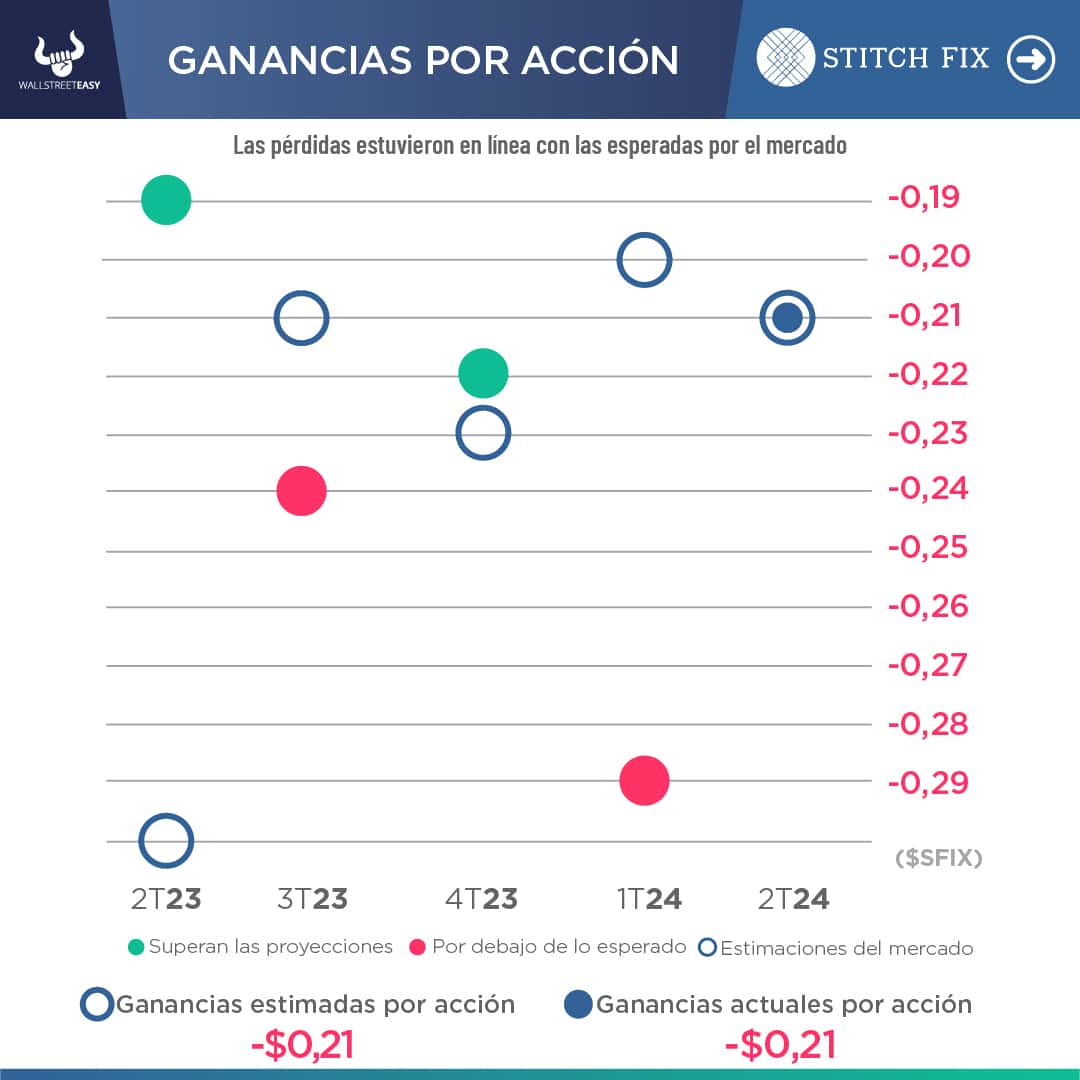 - Los ingresos de Stitch Fix descendieron -18% interanual, hasta $330,4M, según informó la empresa. Los clientes activos cayeron -17% interanual, hasta los 2,8M, y -6% respecto al primer trimestre. Mientras tanto, los ingresos netos por cliente activo disminuyeron solo -3% a $515.