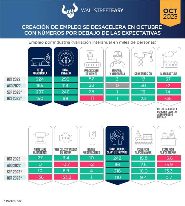 También observamos un efecto importante de las protestas de los sindicatos de los principales fabricantes de autos, Ford, General Motors y Stellantis, ya que se reporta una fuerte caída en el sector de autos y artículos duraderos, ambos con más de 30 mil empleos. Es decir, el sector está perdiendo una cantidad importante de empleados.