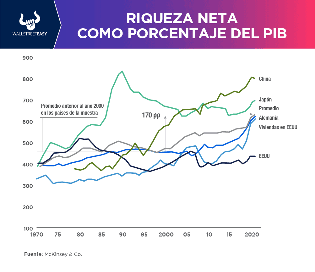 La riqueza neta global era de $610B a fines de 2021. Solo alrededor de una quinta parte del crecimiento de la riqueza provino de los ahorradores que canalizaron dinero hacia nuevas inversiones, y la inflación de los precios de los activos debido a las bajas tasas de interés contribuyó con cerca del 80%.