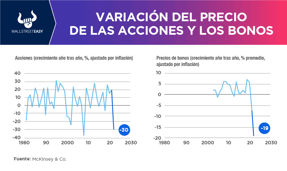 A medida que aumentaron la inflación y las tasas de interés, los precios de las acciones y los bonos a nivel mundial disminuyeron alrededor de 30% y 20% en términos reales, respectivamente. Los títulos inmobiliarios crecieron más lentamente que la inflación y cayeron en términos nominales en varios mercados. A pesar del aumento de la inflación, la deuda siguió creciendo ligeramente más rápido que el PIB a valores nominales.