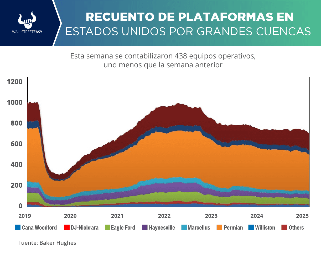 Baker Hughes, actualmente en EEUU se encuentran 554 equipos activos (incluyendo los de gas). En la actividad petrolera se contabilizaron 438, uno menos que la semana anterior. En las operaciones de gas hay 111 equipos operativos, dos menos que hace siete días. Hace un año estaban activas 588 plataformas.