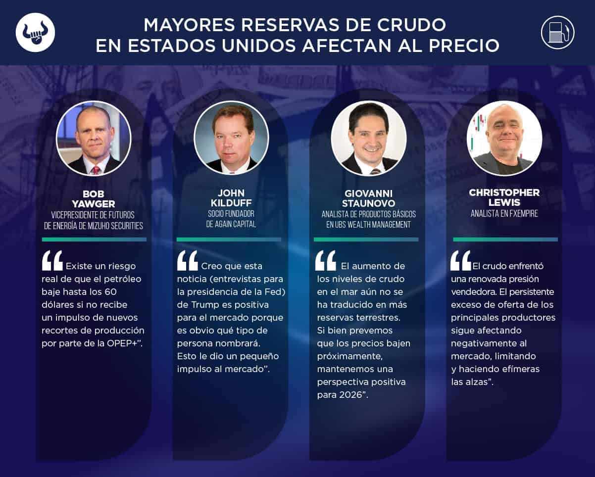 EIA, por sus siglas en inglés) reportó 835,1M de barriles en existencias de crudo, tanto comerciales como estratégicas, lo que representa una baja de 2,9M de barriles. El Instituto Americano del Petróleo (