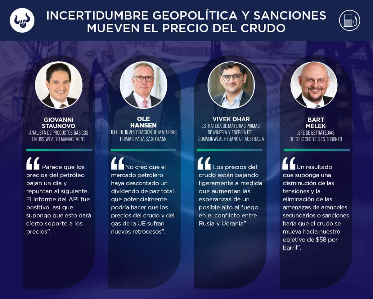 El precio del petróleo se ha mostrado volátil esta semana, fluctuando diariamente en respuesta a la incertidumbre geopolítica en torno a la guerra de Ucrania y sus sanciones. Los precios suben o bajan dependiendo de si las noticias sugieren que la oferta de crudo ruso disminuirá (por nuevas sanciones) o aumentará (por el cese de sanciones), a lo que se suman los datos de inventarios estadounidenses. Nuevo rango esperado es de $62 - $64.