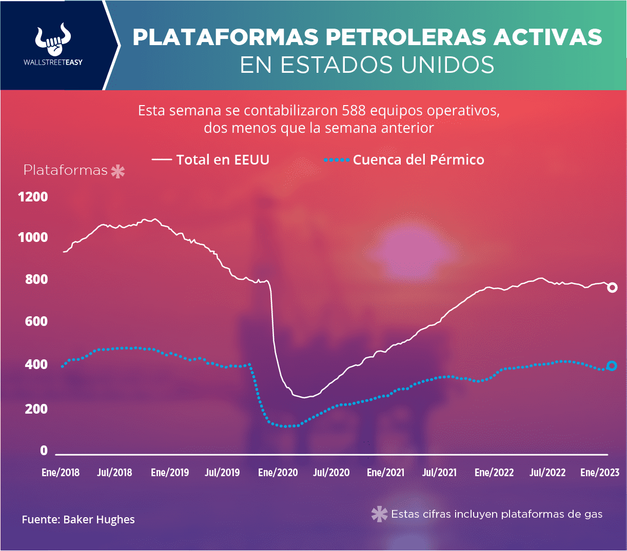 CUÉNTAME SOBRE LAS PLATAFORMAS PETROLERAS EN EEUU De acuerdo con información de Baker Hughes, actualmente en EEUU se encuentran 748 equipos activos (incluyendo los de gas). En la actividad petrolera se contabilizaron 588, dos menos que la semana anterior. En las operaciones de gas hay 157 equipos operativos, uno menos que hace siete días. Hace un año estaban activas 689 plataformas.
