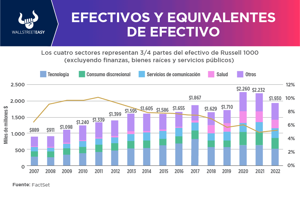 El saldo de efectivo de las empresas del Russell 1000 cayó a $1,9B al final del tercer trimestre de 2022, por debajo del pico de $2,26B que se tenía en 2020. Desde que acumularon saldos de efectivo a niveles récord durante la pandemia del Covid-19, las empresas han estado destinando más efectivo a la recompra de acciones, gastos de capital y adquisiciones.