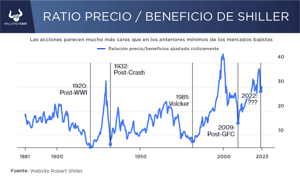 Ahora veremos algunos argumentos a favor de que estamos viendo solo un rally dentro de un mercado bajista, en primer lugar, el mercado está demasiado caro, y es que los mercados alcistas comienzan cuando las acciones están baratas. La valoración del mercado actualmente es demasiado alta para esto. El siguiente gráfico marca todos los fondos anteriores del mercado bajista desde la década de 1920 junto a la relación precio / beneficio de Shiller.