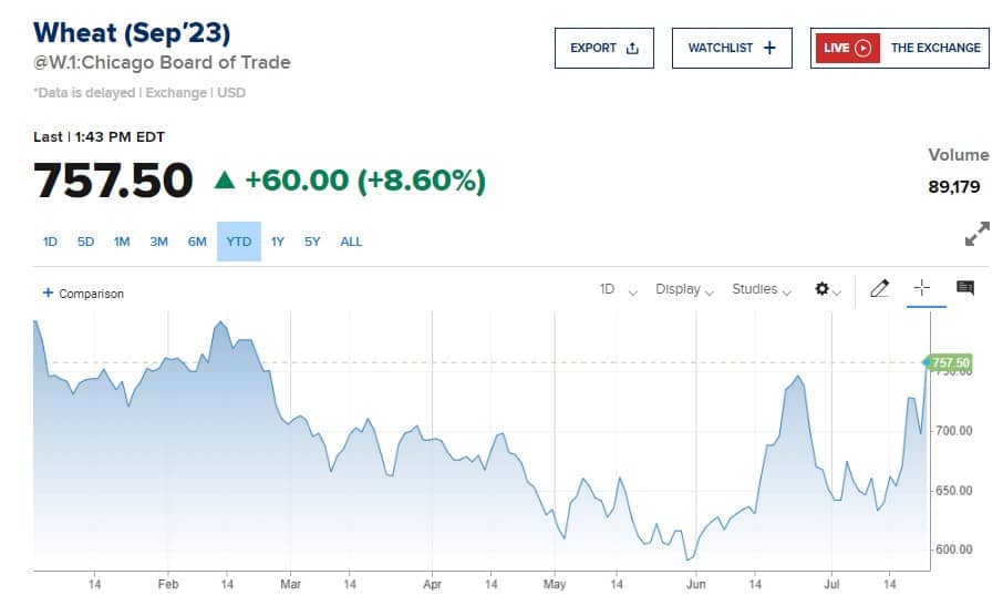 Hasta ahora el precio no había subido tanto, a pesar de que el acuerdo se eliminó hace dos semanas, ya que luego de lo que Rusia empezó a atacar los puertos donde se exportaba el trigo, como Odesa, Ucrania empezó a exportar por otros puertos como el de Ismail y Reni que están en el río Danubio, muy cercano a Rumania. Se pensaba que Rusia no se atrevería a atacar territorios tan cercanos a un país miembro de la OTAN, pero hoy decidió atacar el puerto de Reni y esto asusta mucho al mercado de trigo, cuyo precio de hoy alcanzó su nivel más alto desde febrero de este año, superando el nivel anterior de abril.