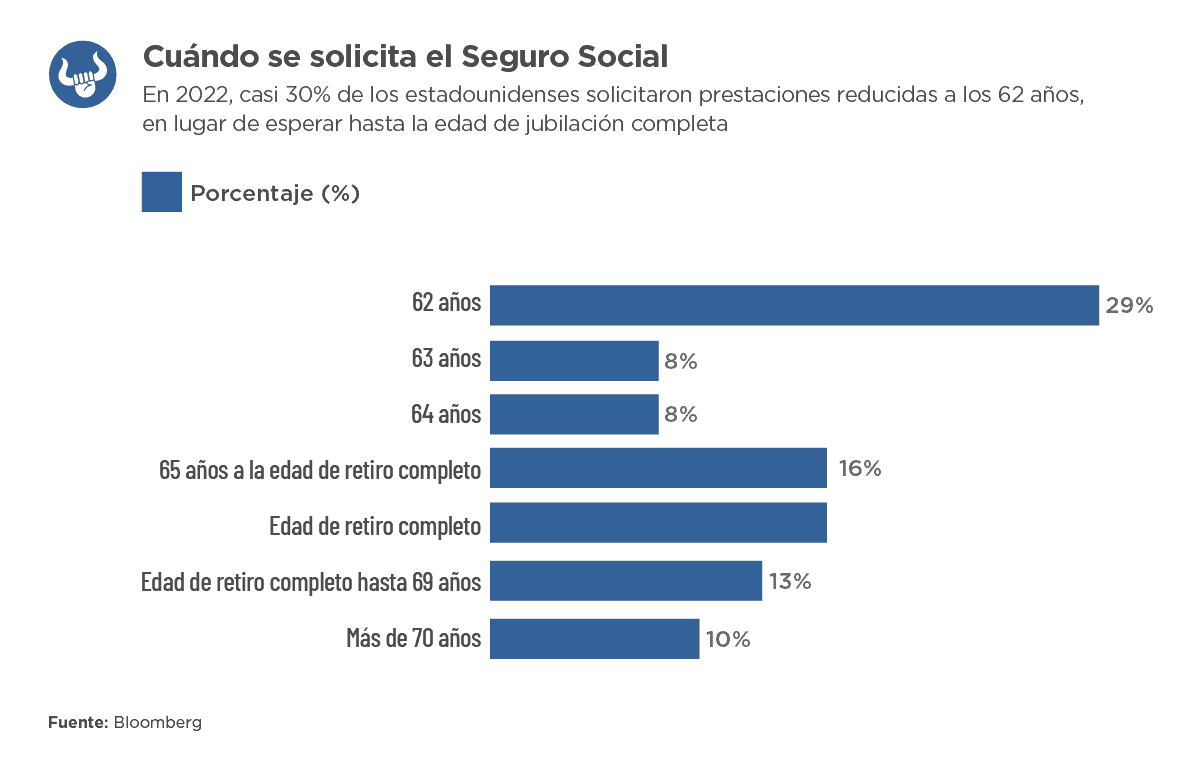 Para obtener el máximo beneficio de la Seguridad Social, intente aguantar más allá de la primera edad disponible para solicitarla, que es 62 años. Aunque muchos la solicitan a esta edad, hacerlo supone una reducción del 30% en comparación con lo que obtendrían a los 67 años, que se considera la «edad de jubilación completa» para las personas nacidas en 1960 o después.