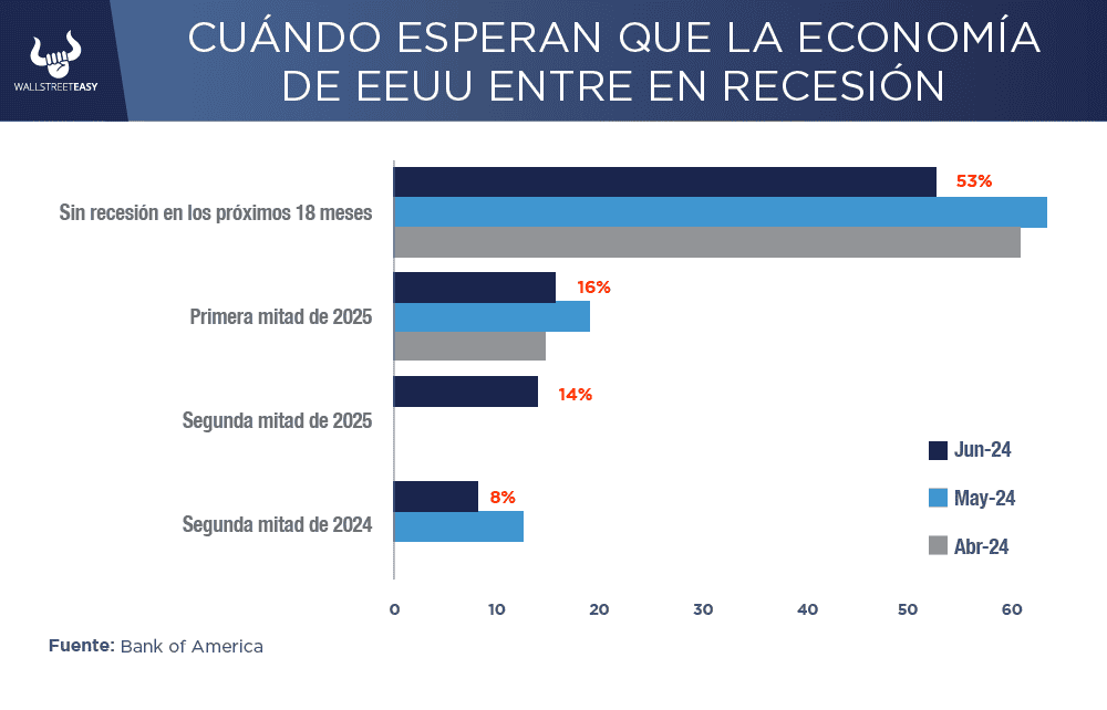 DAME CONTEXTO Cualquiera que sea el pesimismo, no está afectando al mundo de las inversiones. Como evidencia, la última edición de la encuesta mensual de administradores de fondos globales de Bank of America, muestra un aumento continuo en el optimismo general, expresado por asignaciones reducidas a efectivo y movimientos más fuertes en las acciones. La mayoría de los gerentes (53%) cree que no habrá recesión en los próximos 18 meses.