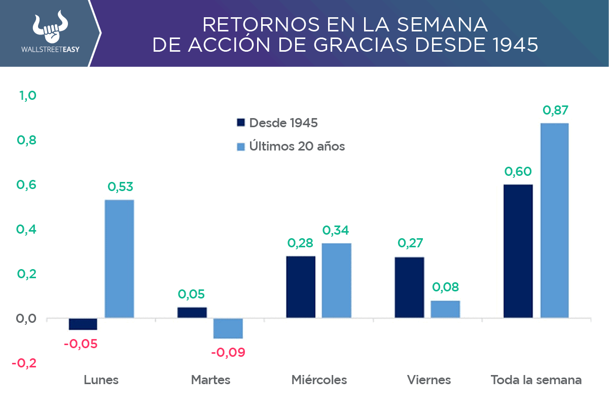 Históricamente, desde 1945, en esta semana de Acción de Gracias, el lunes el mercado ha caído. Sin embargo, en los últimos 20 años ha sido el mejor día de la semana, con un martes tranquilo, un miércoles con nuevas subidas antes del asueto y finalmente, un viernes un poco más calmado en una jornada corta.