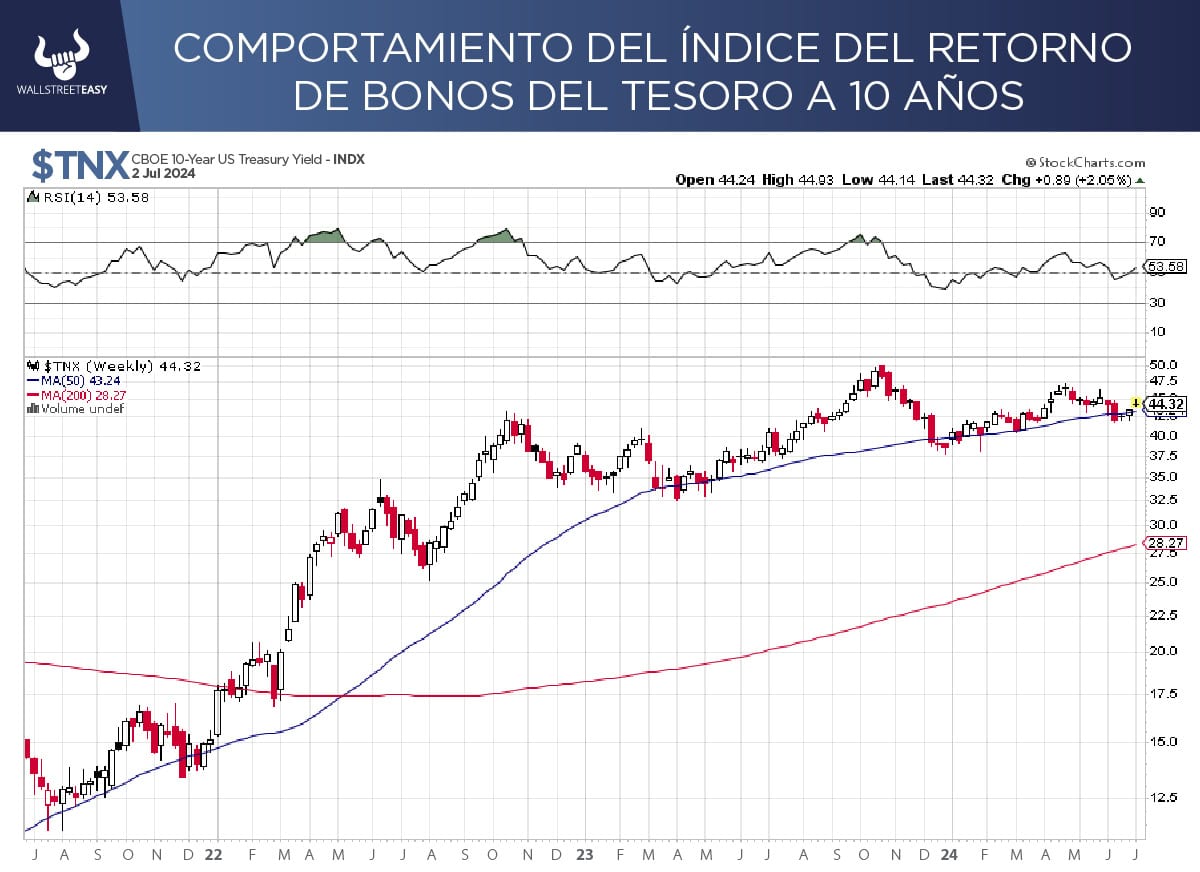 QUÉ QUÉ Así que pareciera que el mercado sigue bastante tranquilo, probablemente considerando que estamos en una semana corta de trading, pero sin que tengamos ningún tipo de nuevo movimiento. OTRA NOVEDAD Por último, hay una subida importante en el rendimiento de los bonos del Tesoro, sobre lo que se rumora puede deberse al aumento importante de probabilidad del ex presidente Trump de ganar las próximas elecciones de EE.UU., después de la negativa actuación del presidente Biden en el debate de la semana pasada.