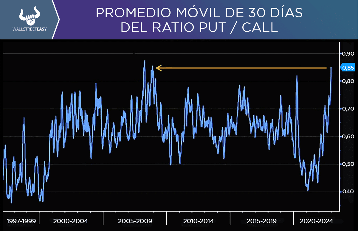 Ante la volatilidad que ha causado dicho mensaje a corto plazo, vemos cómo el ratio put / call llega a niveles de 2009. Generalmente, esto es contraintuitivo y ver un ratio tan elevado tiende a traer buenos retornos a corto plazo.