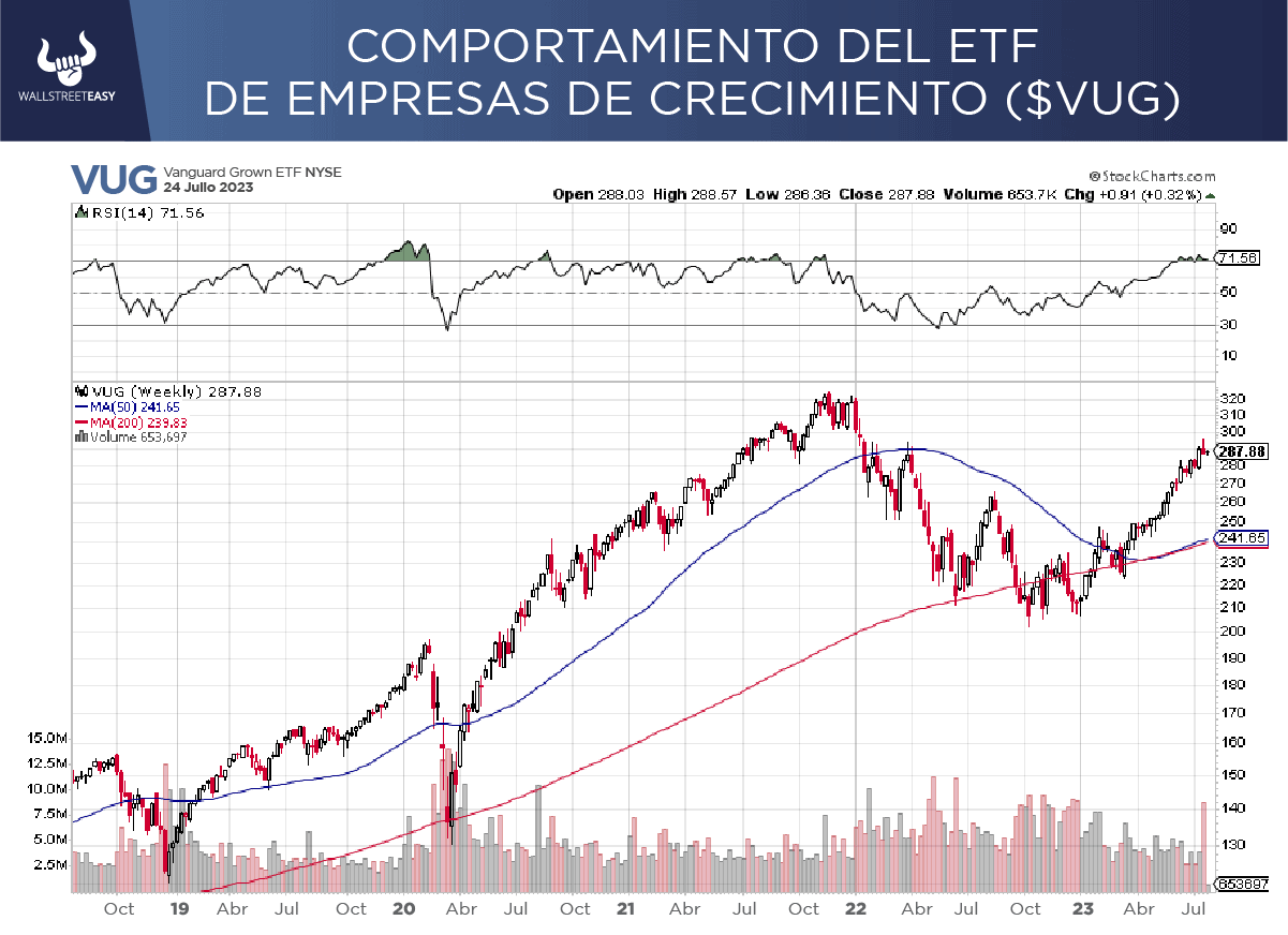 Del otro lado, vemos el segmento de crecimiento que, si bien ha sido el que más ha ganado porcentualmente en los últimos meses, también es bueno considerar que está en una sobrecompra severa desde el punto de vista semanal, según su RSI.