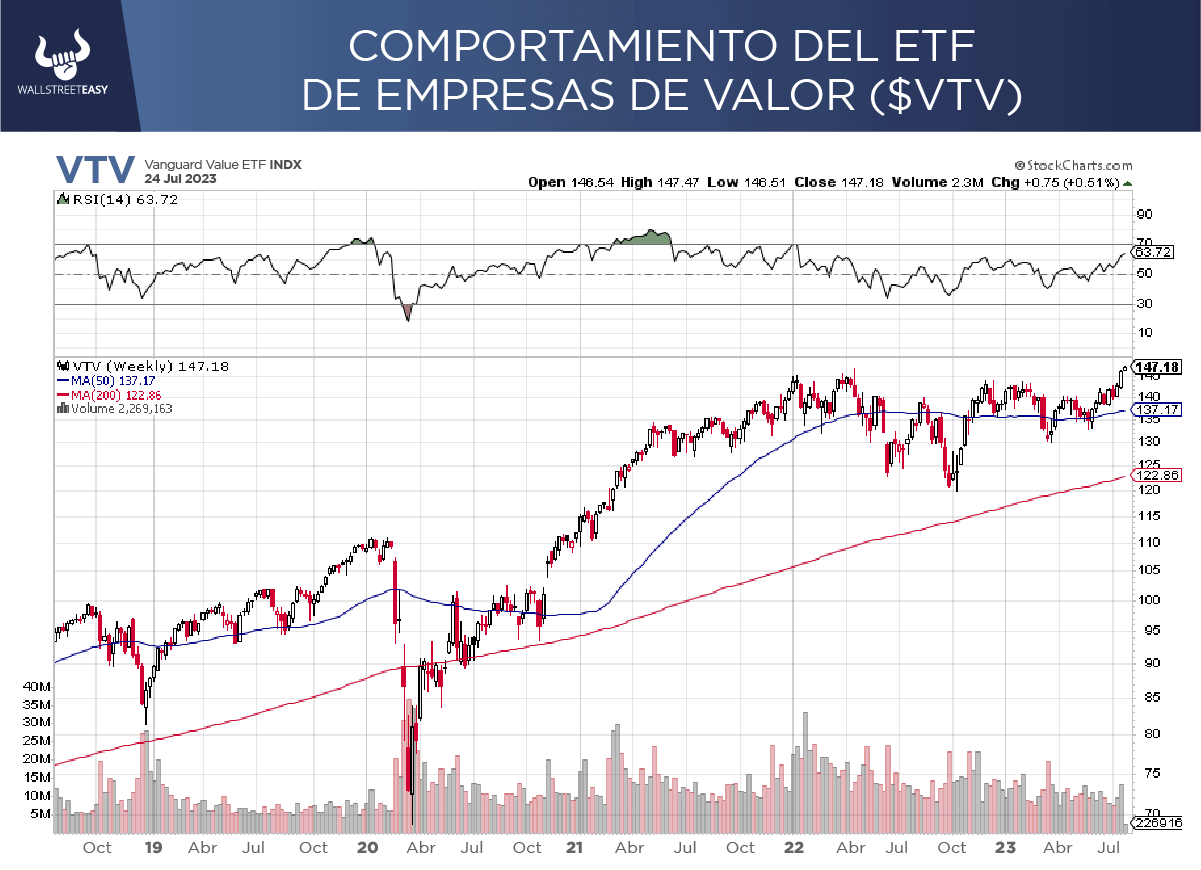 Esto está trayendo como consecuencia que los movimientos se den en otro tipo de situaciones como es la rotación, y por eso vemos al ETF de valor subir fuerte en la última semana y de hecho, hizo breakout de varios años.