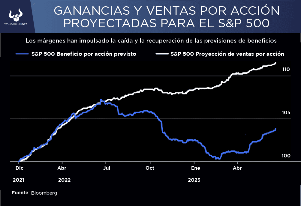 Si observamos las ganancias y las ventas por acción proyectadas a 12 meses para el S&P 500, encontramos que las ventas proyectadas han seguido aumentando desde que el mercado tocó techo a principios de 2022. Esto es, en términos nominales, por lo que la inflación ha ayudado: "venda la misma cantidad de cosas por un precio ligeramente más alto y sus ingresos aumentarán".