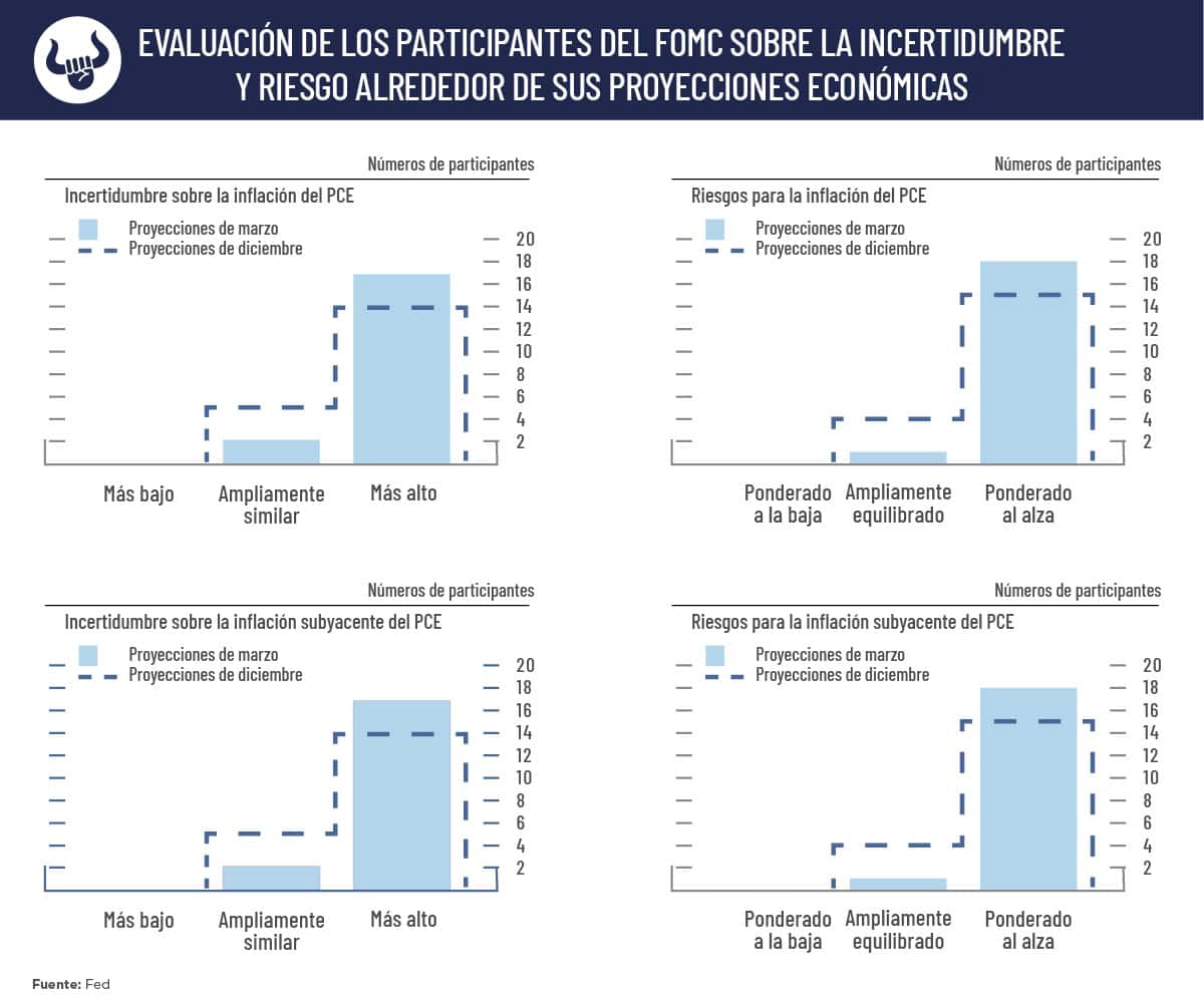 Los miembros de la Fed también redujeron considerablemente sus expectativas de crecimiento económico, al mismo tiempo que aumentaron sus expectativas de inflación.