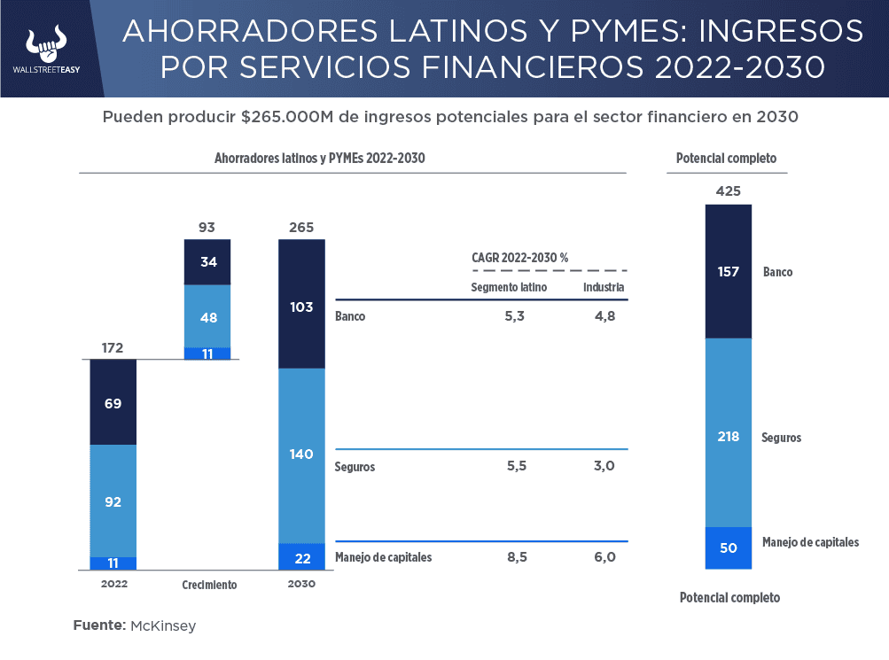Los latinos son un grupo altamente emprendedor, que crea empresas a un ritmo tres veces superior al de la población general. El gasto de los empresarios latinos en banca y seguros crecerá, según el informe de McKinsey, de $17.000M en 2022 a $25.000M en 2030. Sin embargo, un obstáculo persistente para los empresarios latinos es la dificultad para obtener financiación. En el mismo informe, se muestra una brecha crediticia de $200.000M entre las PYMES de propiedad latina y sus contrapartes de propiedad blanca. Esta brecha se mantiene debido a procesos de préstamo largos y abrumadores.