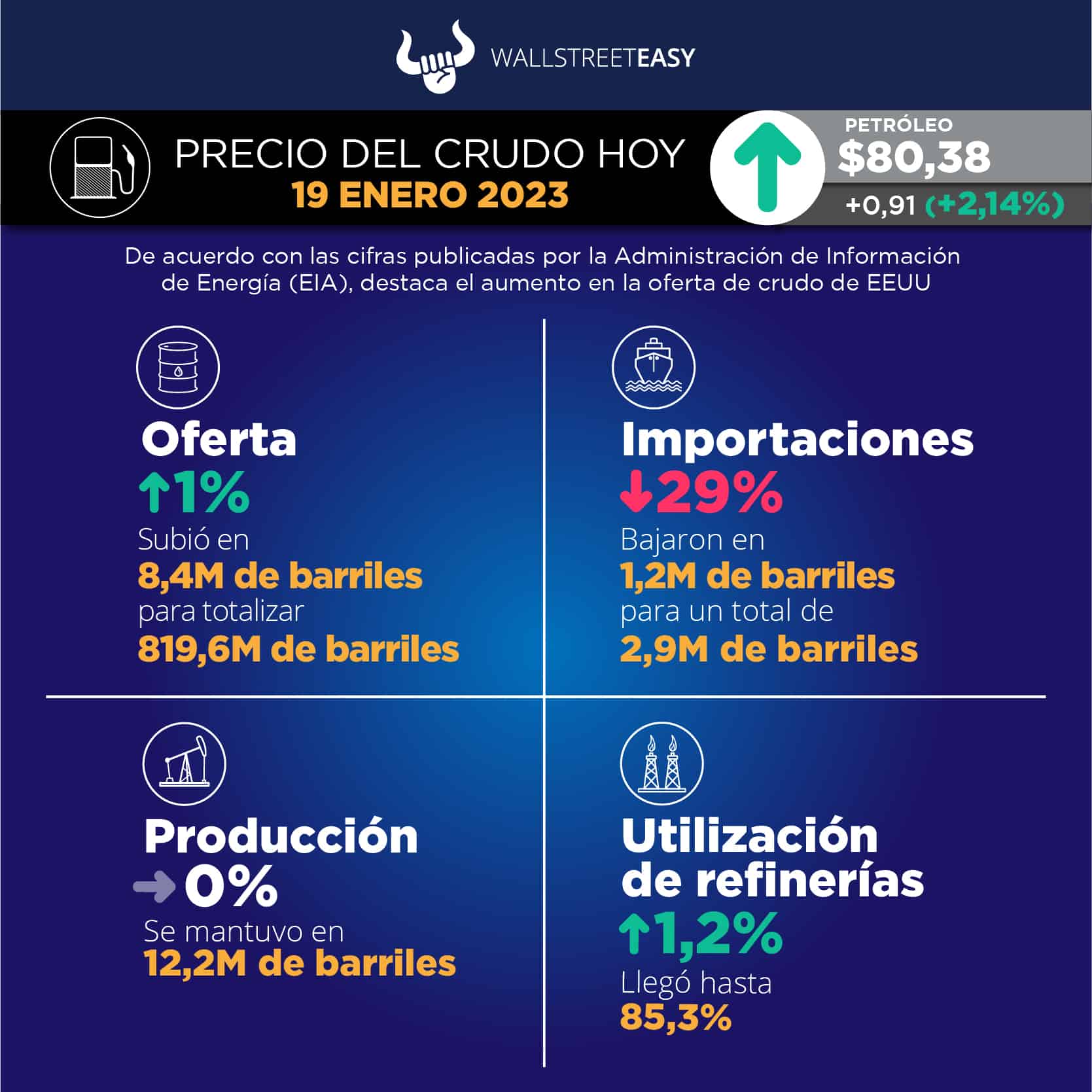 EIA, por sus siglas en inglés) reportó 819,6M de barriles en existencias de crudo, tanto comerciales como estratégicas, lo que representa un aumento de 8,4M de barriles. El Instituto Americano del Petróleo (