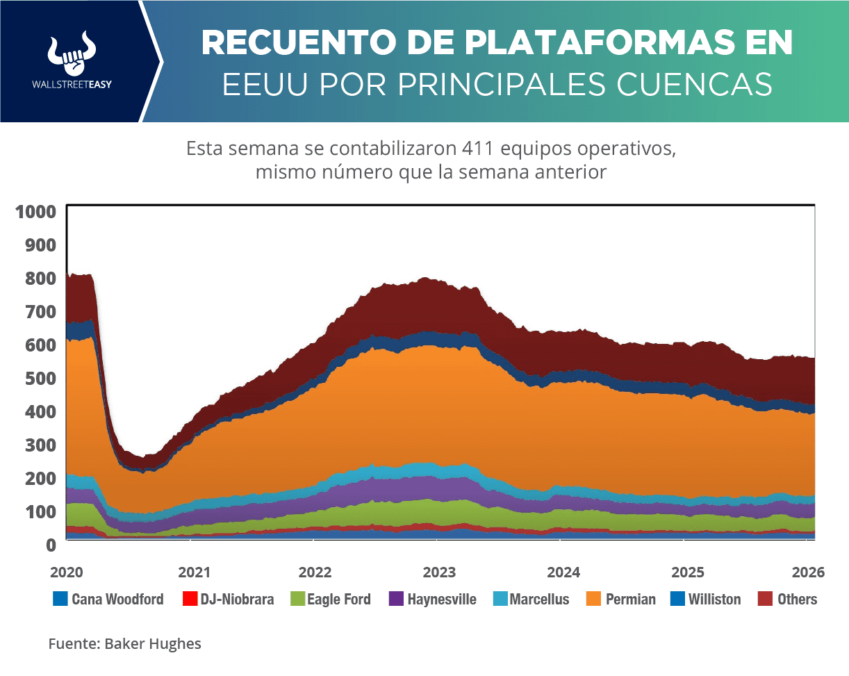 Baker Hughes, actualmente en EEUU se encuentran 546 equipos activos (incluyendo los de gas). En la actividad petrolera se contabilizaron 411, mismo número que la semana anterior. En las operaciones de gas hay 125 equipos operativos, tres más que hace siete días. Hace un año estaban activas 582 plataformas.