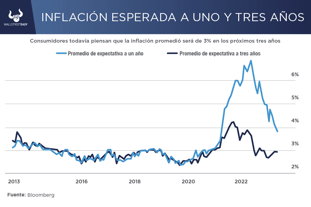 Los consumidores parecen estar de acuerdo en que la inflación tardará un tiempo en bajar. La encuesta mensual de Expectativas del Consumidor de la Fed de Nueva York, publicada el lunes, muestra que las predicciones para la inflación de los próximos 12 meses continúan disminuyendo, y ahora en su nivel más bajo desde abril de 2021. Sin embargo, sus pronósticos para los próximos tres años siguen siendo rígidos en 3%, justo en la parte superior del rango objetivo de la FED.