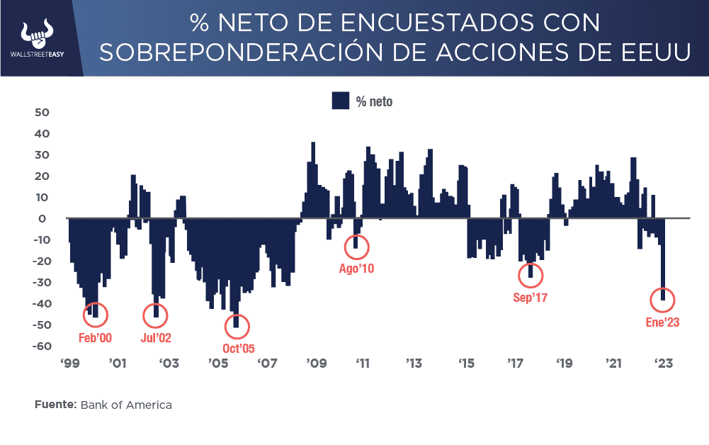 Según la última encuesta de Bank of America ($BAC) a los administradores de fondos, los inversionistas están más infraponderados (invertir en un valor en una proporción inferior a la que este valor representa) en las acciones de EEUU, que en cualquier momento desde 2005, ya que la mejora de la confianza del mercado los ha llevado a buscar otras regiones.