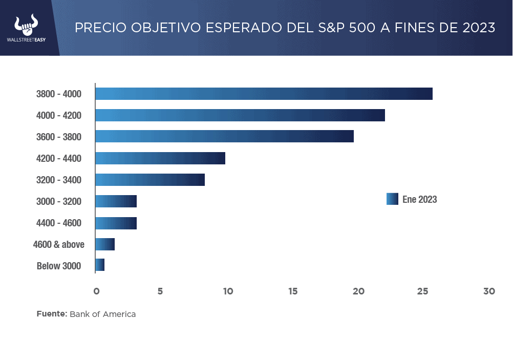 Para la encuesta de enero se reveló que más de la mitad de los encuestados esperan que el S&P 500 cierre 2023 por debajo de la marca de 4.000 puntos, donde el rango más respondido en el que esperan que cierre el índice de referencia es entre 3.800 y 4.000.