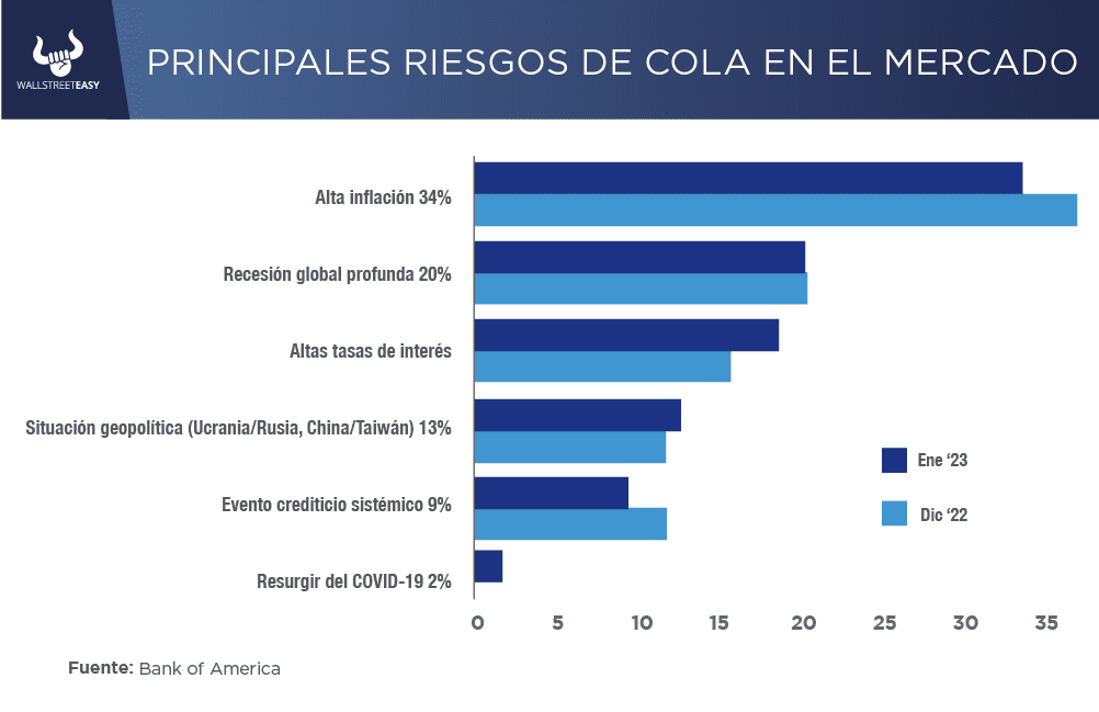 En relación a los mayores riesgos de cola, que la inflación se mantenga alta sigue siendo el principal ocupando la primera posición por séptimo mes consecutivo, por delante de una recesión global profunda.