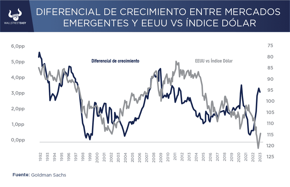 DAME CONTEXTO Hay muchas razones para el resurgimiento, lideradas por el debilitamiento del dólar y la reapertura de China, como se discutió hace algunas semanas. ¿ENTONCES? El dólar se ha depreciado -7% desde su máximo de octubre, lo que ha impulsado al alza los activos de los mercados emergentes. Históricamente, los dos han tenido una relación inversa. En lo que va del año, las acciones y el tipo de cambio de los mercados emergentes han disfrutado de una fuerte racha.