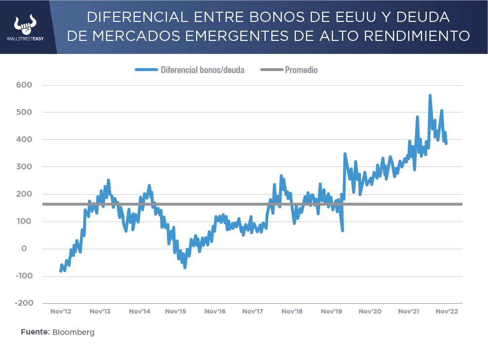 ¿OTRO DATO RELEVANTE? Este diferencial pudiera ampliarse más si EEUU se desacelera más de lo que ahora se espera, y además, también se indica que hay espacio para que el dólar se debilite aún más, lo que podría dar un mayor rendimiento superior de los mercados emergentes. ¿QUÉ MÁS PASÓ? La reapertura económica de China, a medida que caen las restricciones del COVID-19 ha sido crucial y contribuye a un aumento de las acciones del gigante asiático y en toda la región de Asia-Pacífico. Los activos chinos representan una parte considerable de los índices de mercados emergentes, por lo que vemos a estos mercados como beneficiarios de la reapertura. ¿OTRO ACONTECIMIENTO? Es probable que el aumento de la demanda china beneficie a otros exportadores de mercados emergentes con fuertes vínculos con China, a medida que se recupera el crecimiento. Pero, mientras las acciones de los mercados emergentes dominan comprensiblemente la atención, la deuda de estos mercados tiende a ser ignorada. ¿OTRA NOVEDAD? El año pasado se registraron salidas récord de las carteras de deuda de los mercados emergentes, pero las condiciones técnicas deberían ser más favorables en 2023 dado las valoraciones más atractivas, tanto en términos absolutos como en términos relativos, al compararlos con los bonos de alto rendimiento de EEUU.