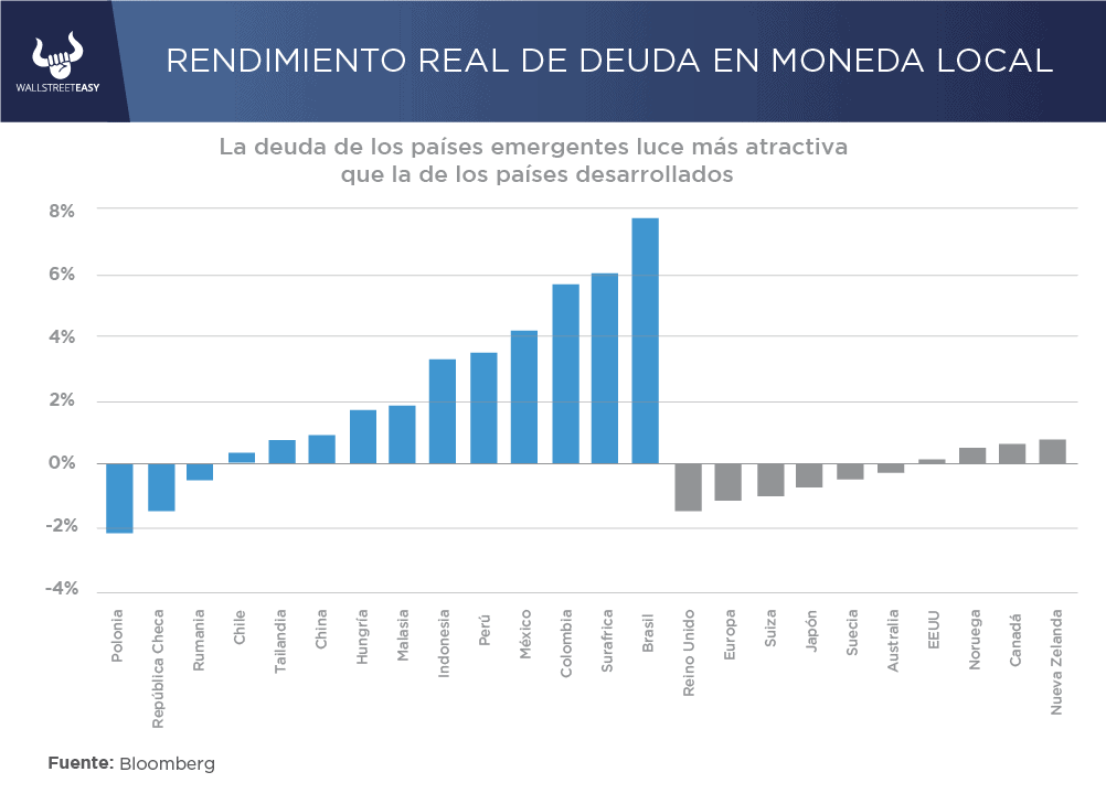 POR ÚLTIMO El hecho de que muchos bancos centrales emergentes se vieran obligados a comenzar a subir tasas de interés en 2021, mucho antes que la Reserva Federal y el Banco Central Europeo, ha dejado a muchos bonos soberanos de mercados emergentes ofreciendo rendimientos atractivos. EN CONCRETO Los bonos del Tesoro de los mercados emergentes han tratado de impulsar su emisión de deuda en moneda local en los últimos años para reducir la vulnerabilidad ante un aumento repentino del dólar. Muchos ahora están rindiendo muy por encima de la tasa de inflación local, lo que los hace mucho más atractivos que la mayoría de los soberanos de mercados desarrollados.